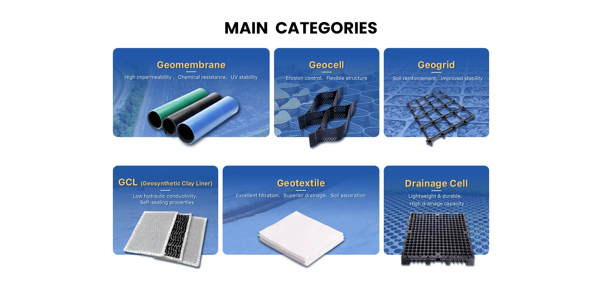 Productos principales:Geomembrana, Geotextil, Geocell, Geogrid, Revestimiento de Arcilla Geosintética